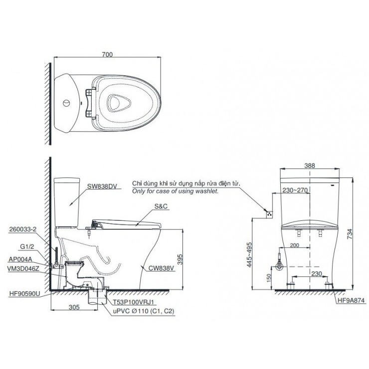 Kích thước (DxRxC): 700 x 388 x 734 (mm). Thiết kế sang trọng, hiện đại. Chiều cao thân cầu lý tưởng giúp người dùng thoải mái khi sử dụng. Phù hợp với mọi không gian nhà tắm.