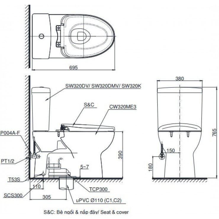Kích thước: 695x380x765 mm. Thiết kế sang trọng, hiện đại. Chiều cao thân cầu lý tưởng giúp người dùng thoải mái khi sử dụng. Phù hợp với mọi không gian nhà tắm.