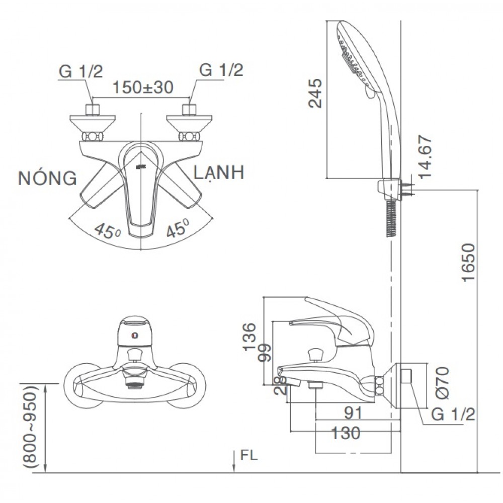 - Áp lực nước : 0.05 MPa ~ 0.75 MPa.