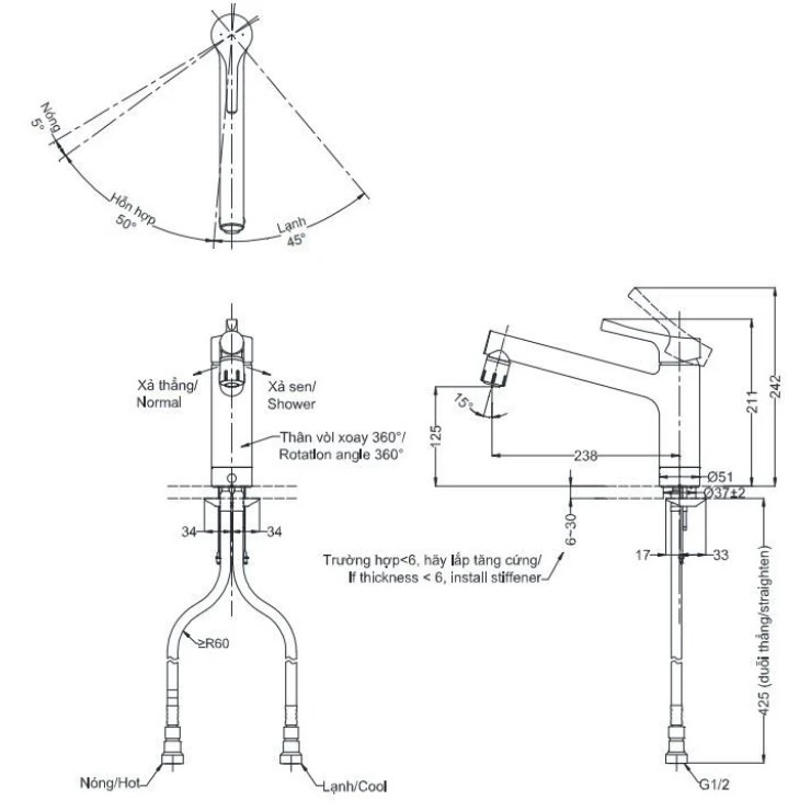 Có thể xoay: 180 độ. 2 chế độ phun nước điều chỉnh ở đầu vòi : xả thẳng và xả Sen đa dạng.