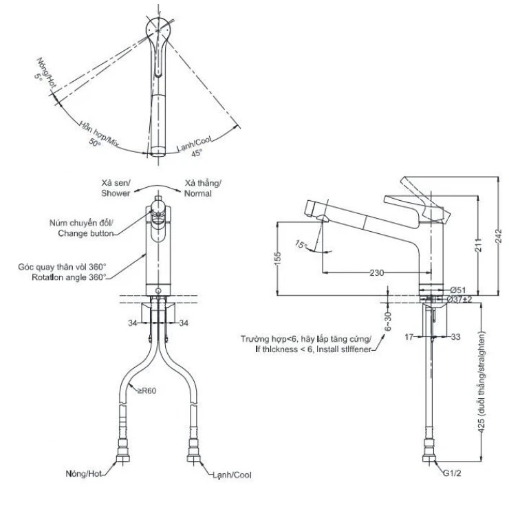 Có thể xoay: 180 độ. 2 chế độ phun nước điều chỉnh ở đầu vòi : xả thẳng và xả Sen đa dạng.