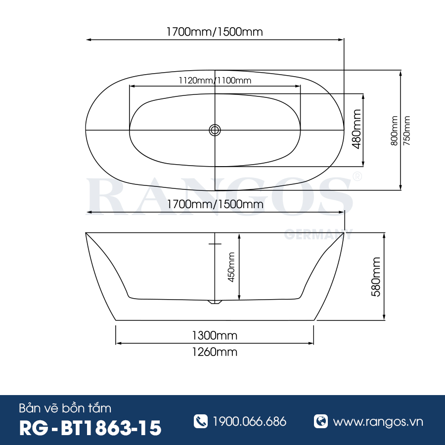 Thiết kế: Bồn tắm hình oval, vành RIM sang trọng và hiện đại.