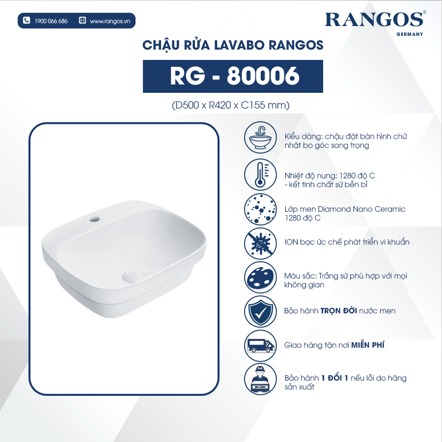 - Thiết kế chậu bán âm bàn, hình chữ nhật bo góc sang trọng