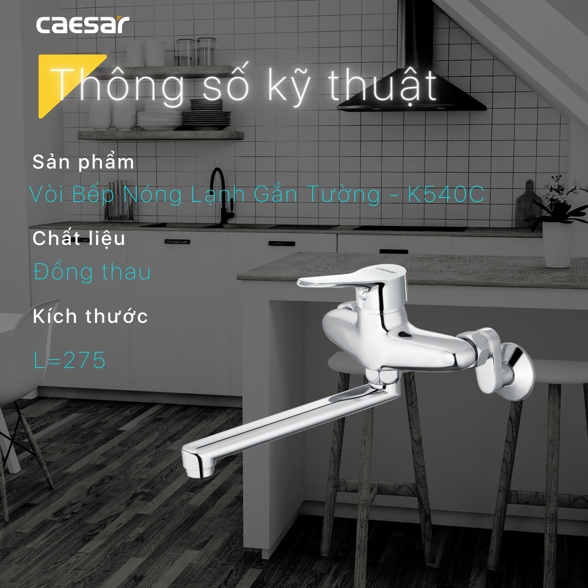 K540C, Vòi Bếp Nóng Lạnh gắn tường. Kích thước (dài): L=275 mm. Hãng sản xuất : CAESAR. Công nghệ: Đài Loan. Sản xuất tại Việt Nam.