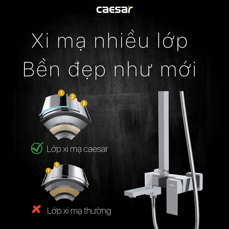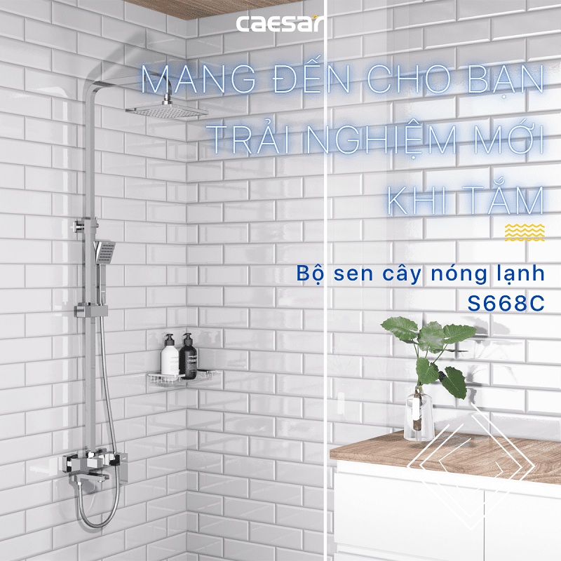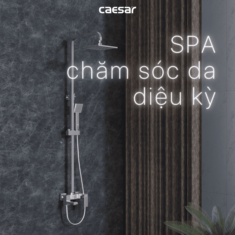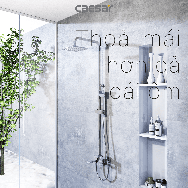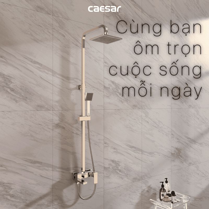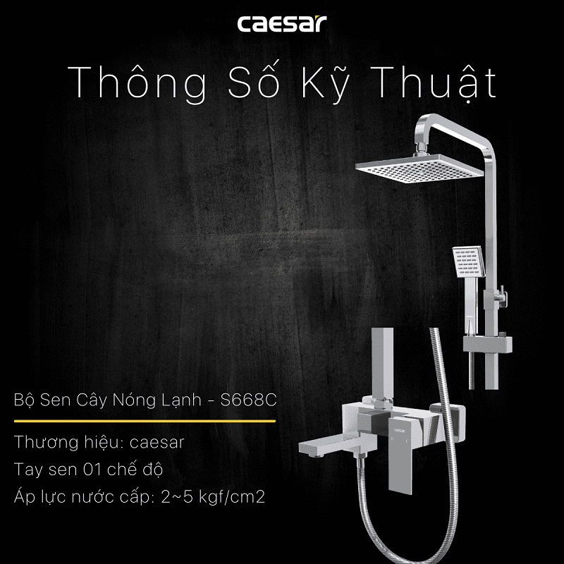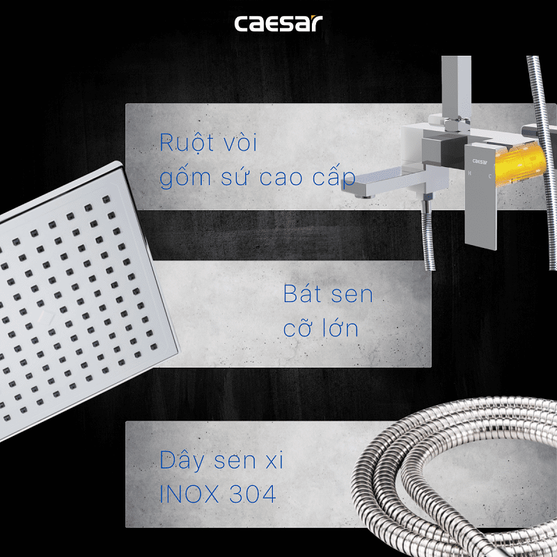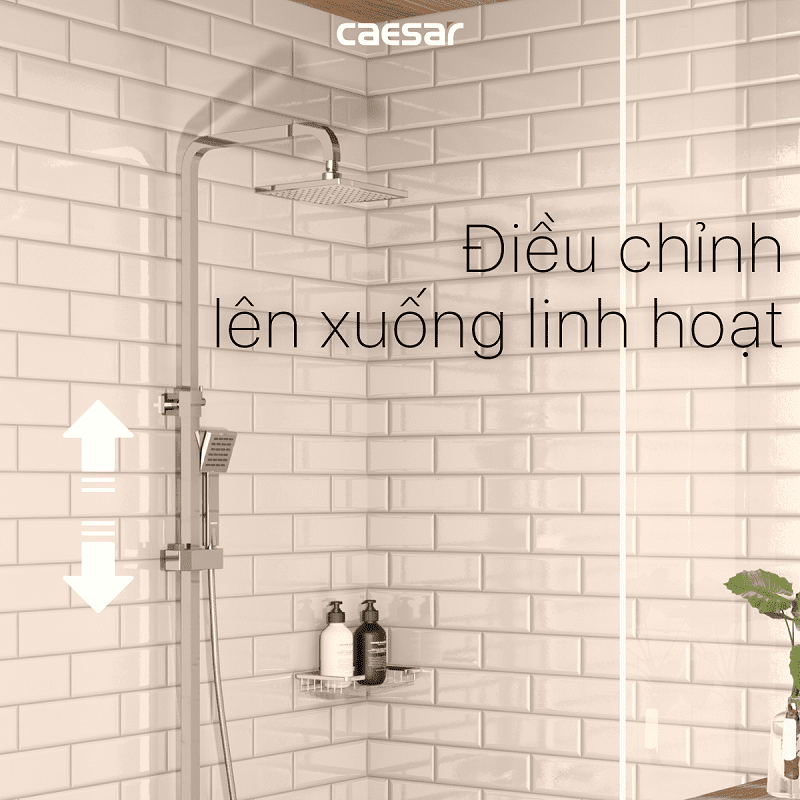 Vòi sen tắm đứng nóng lạnh. Chất liệu chính: Đồng thau. Chất liệu mạ: Crom, Niken. Bộ sen tắm 3 chế độ xả nước: Xả xô, tay sen và bát sen tắm đứng. Sen được thiết kế với công nghệ (ECOFUL SHOWER) giúp tiết kiệm nước. Chiều cao thay đổi: 1000 - 1300 mm. Hãng sản xuất: CAESAR. Công nghệ: Đài Loan. Sản xuất tại Việt Nam.