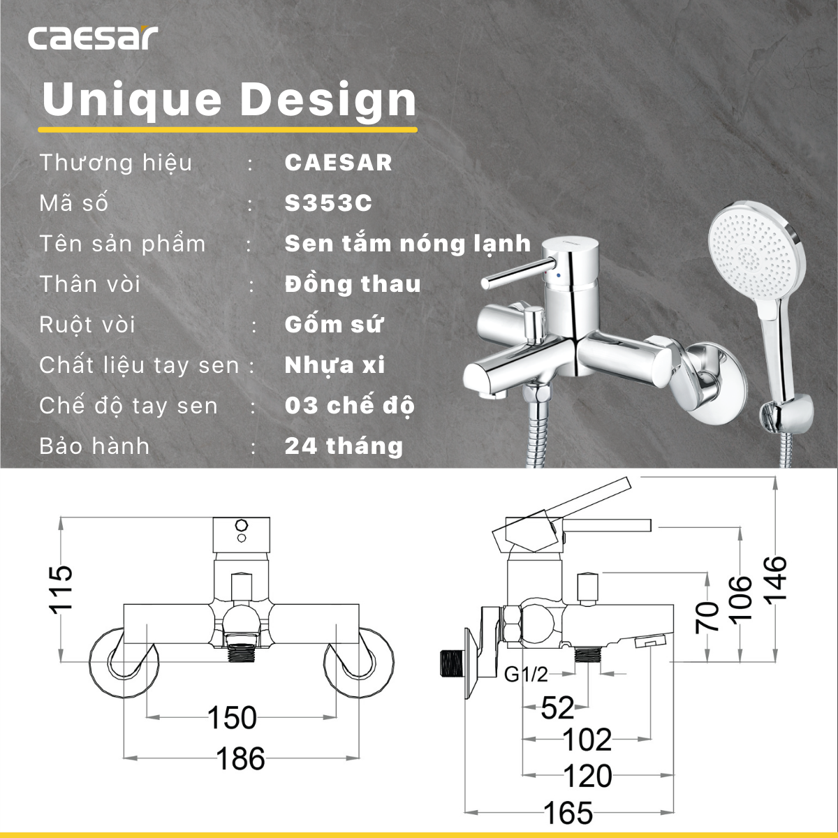 Vòi sen tắm đứng nóng lạnh. Chất liệu chính: Đồng thau. Chất liệu mạ: Crom, Niken. Bộ sen tắm 2 chế độ xả nước: Xả xô qua vòi và tay sen. Sen được thiết kế với công nghệ (ECOFUL SHOWER) giúp tiết kiệm nước. Bao gồm: Củ sen, dây sen 1.5m. Hãng sản xuất: CAESAR. Công nghệ: Đài Loan. Sản xuất tại Việt Nam.