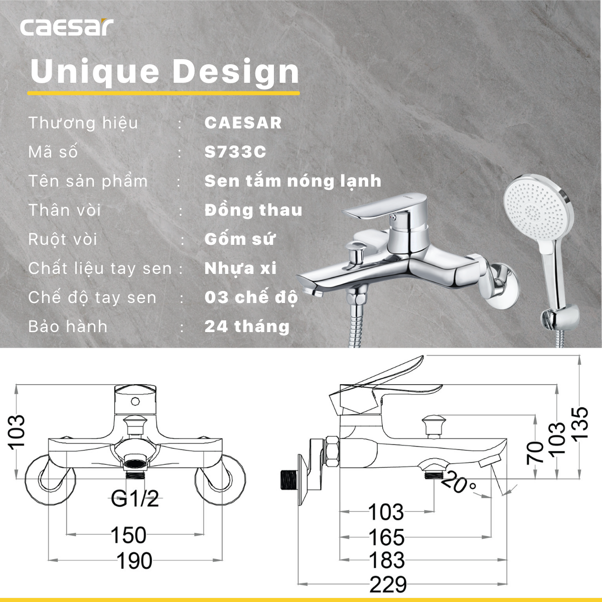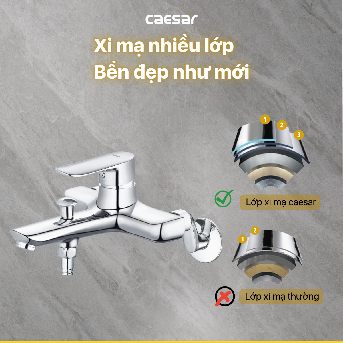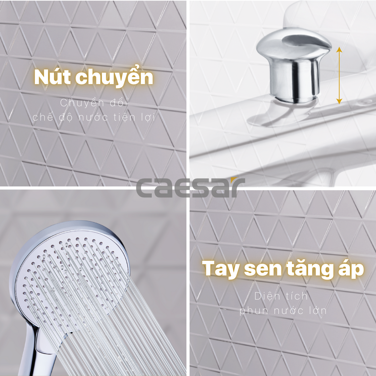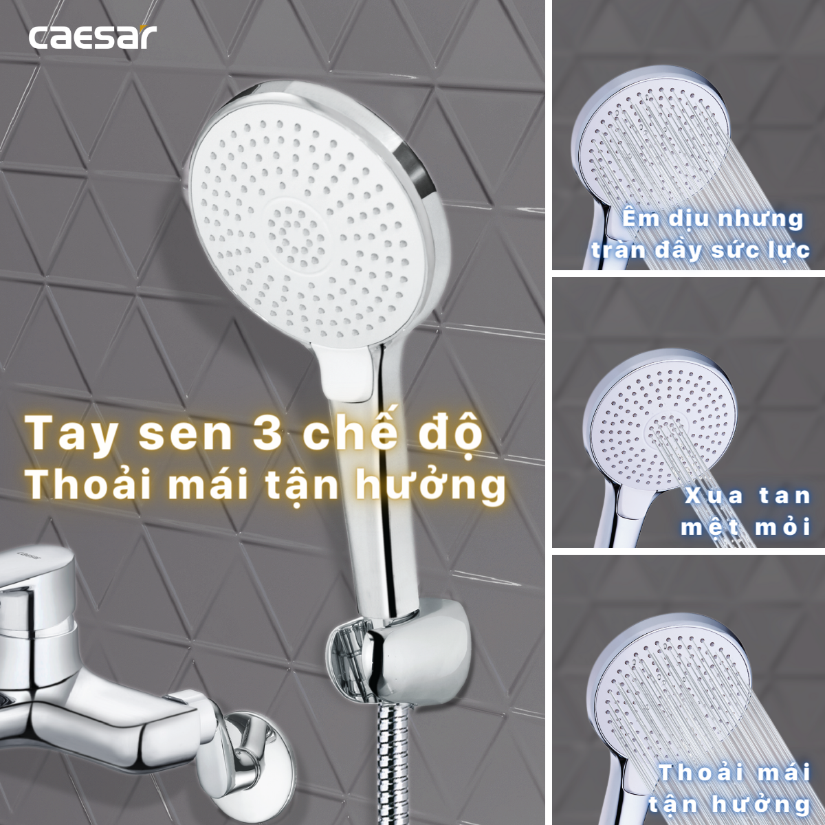 Vòi sen tắm đứng nóng lạnh. Chất liệu chính: Đồng thau. Chất liệu mạ: Crom, Niken. Bộ sen tắm 2 chế độ xả nước: Xả xô qua vòi và tay sen. Sen được thiết kế với công nghệ (ECOFUL SHOWER) giúp tiết kiệm nước. Bao gồm: Củ sen, dây sen 1.5m. Hãng sản xuất: CAESAR. Công nghệ: Đài Loan. Sản xuất tại Việt Nam.