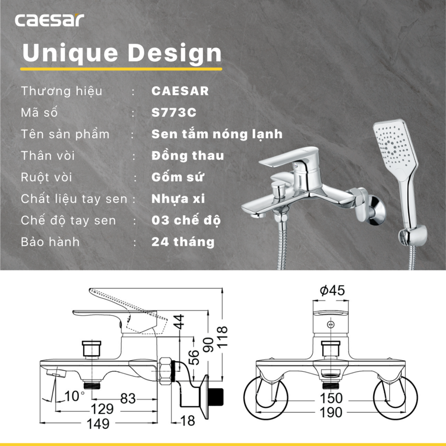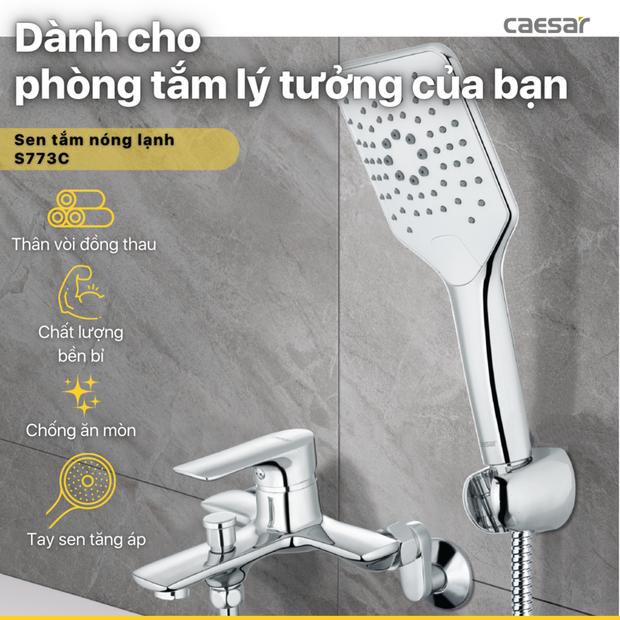 Vòi sen tắm đứng nóng lạnh. Chất liệu chính: Đồng thau. Chất liệu mạ: Crom, Niken. Bộ sen tắm 2 chế độ xả nước: Xả xô qua vòi và tay sen. Sen được thiết kế với công nghệ (ECOFUL SHOWER) giúp tiết kiệm nước. Bao gồm: Củ sen, dây sen 1.5m. Hãng sản xuất: CAESAR. Công nghệ: Đài Loan. Sản xuất tại Việt Nam.