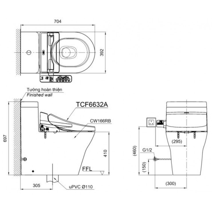 Bao gồm van khóa và gioăng đế nối sàn. Có bảng điều khiển từ xa (không dây) với 2 chế độ người dùng. Men sứ chống dính, chống bám bẩn CEFIONTECT.
